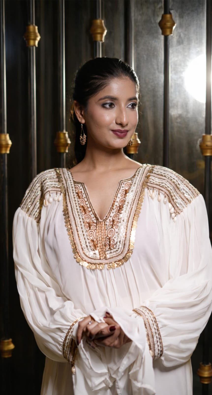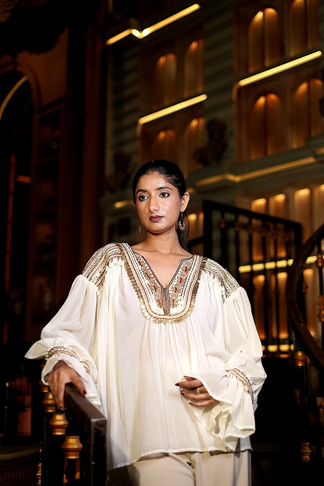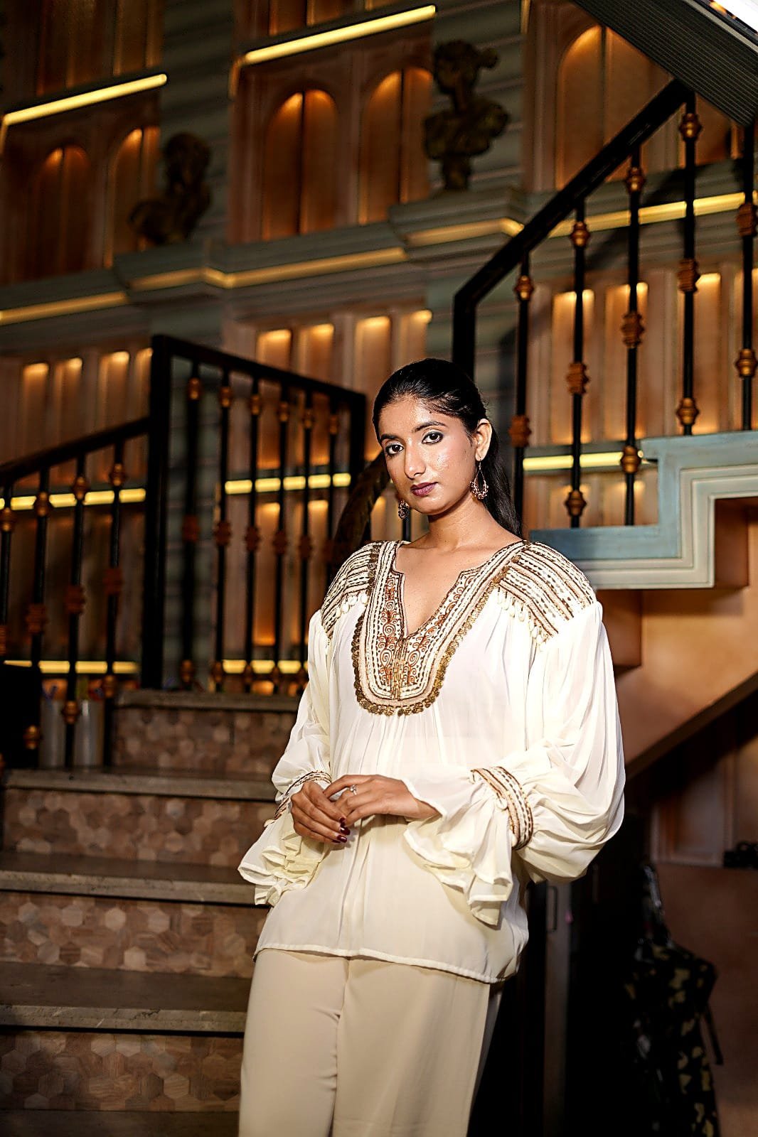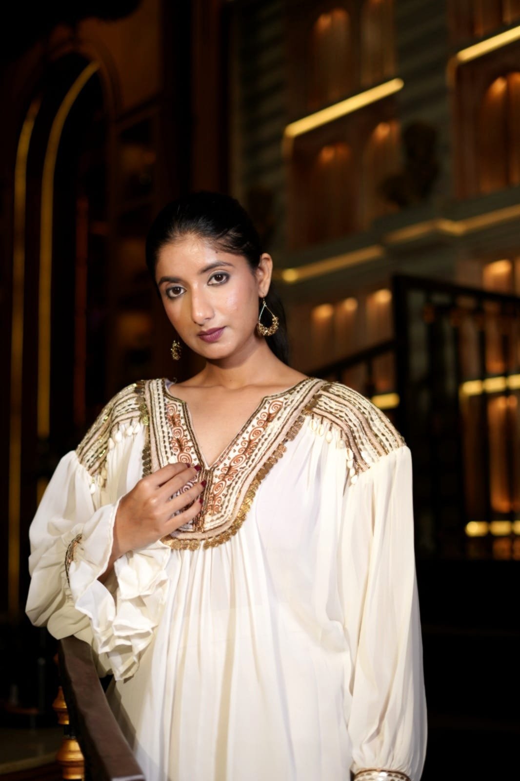 Styling Tip: Elevate the look with statement earrings, bold rings, and strappy heels.